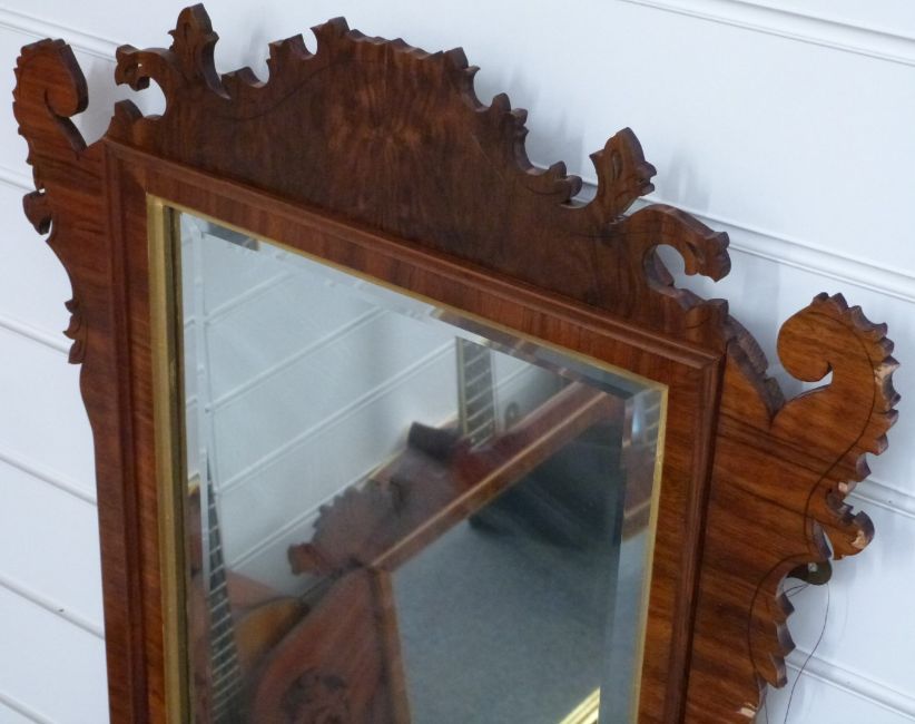 A mahogany wheatear mirror with bevelled glass and crossbanded rosewood and gilt decoration, 88x54cm