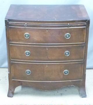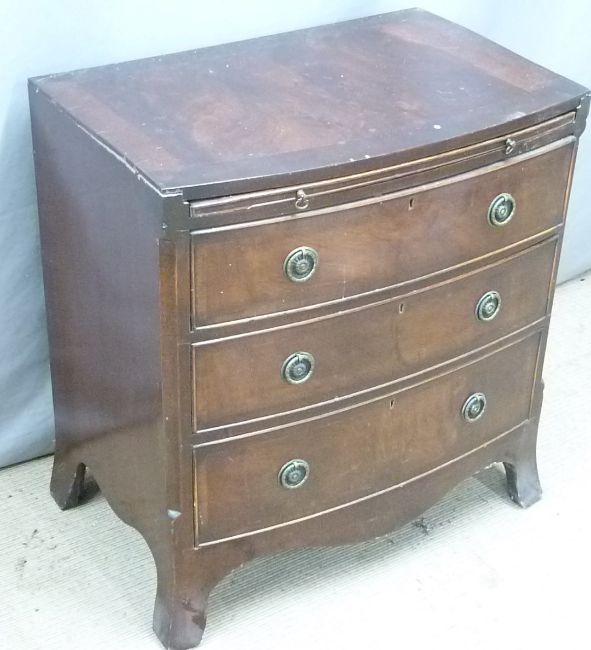 Bow front mahogany bachelor's chest of three drawers with brushing slide above, W70 x D46 x H74cm