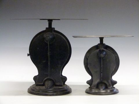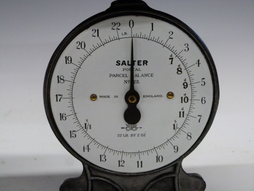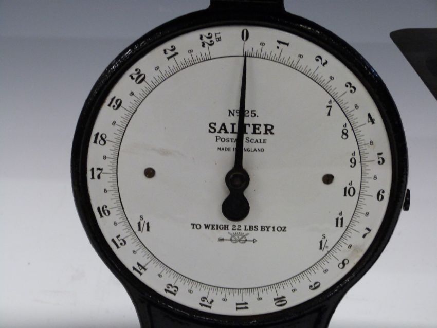 Salter No 25 postal scale to weigh 22lb, height 36cm together with a similar smaller example, both with postage rates to dials