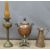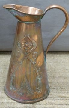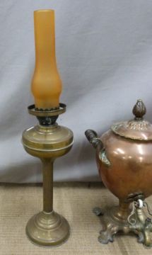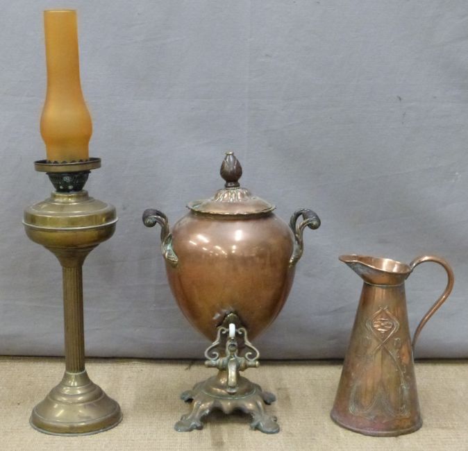 Art Nouveau copper jug, samovar and a brass oil lamp, H66cm