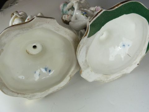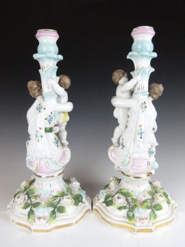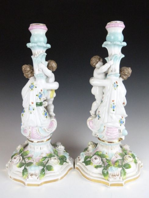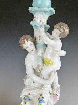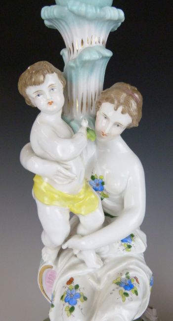 A pair of German porcelain figural candlesticks emblematic of motherhood, with painted and applied flower decoration, probably late 19th / 20thC, height 36cm