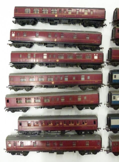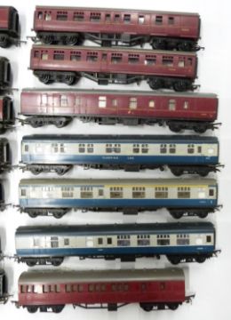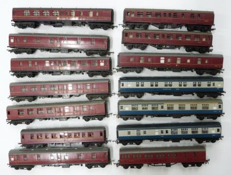 Fourteen Tri-ang and Tri-ang Hornby 00 gauge model railway coaches.