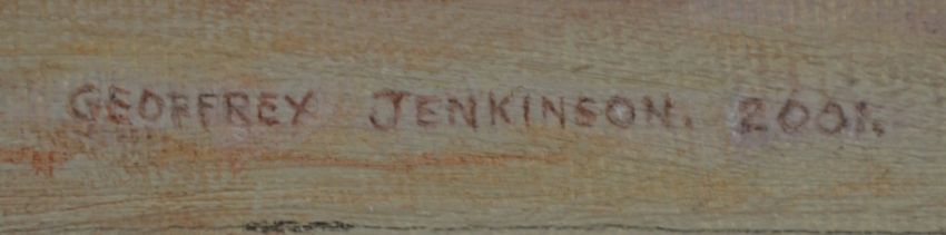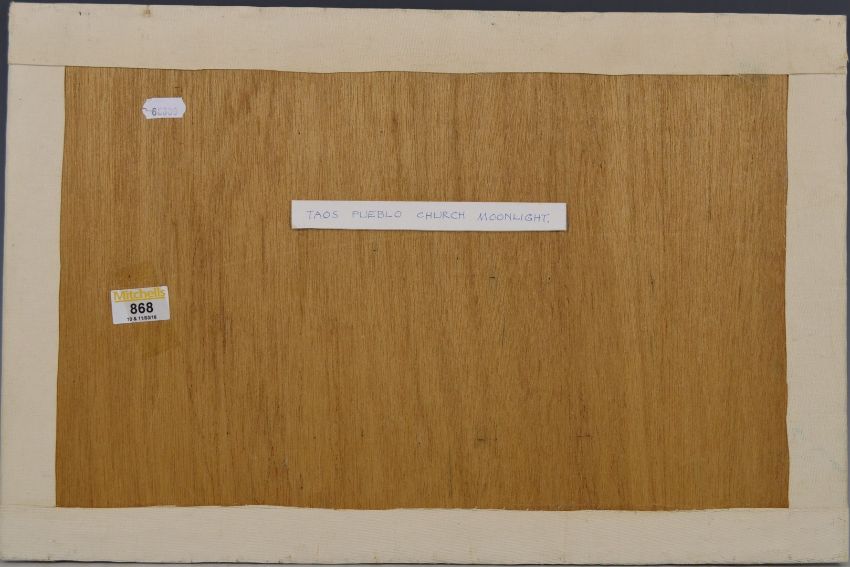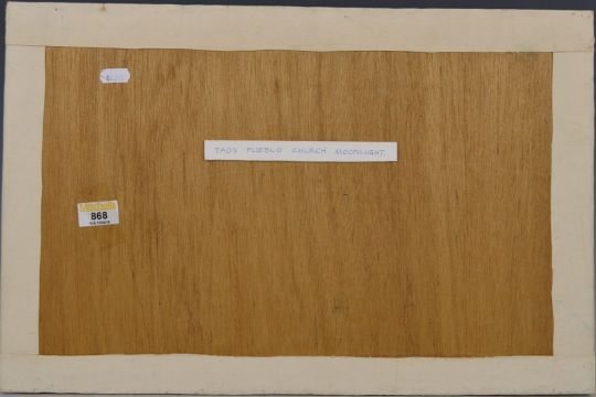 Geoffrey Jenkinson (1925 - 2005) oil on board 'Taos Pueblo Church, Moonlight', signed and dated 2001, 33.5 x 51cm