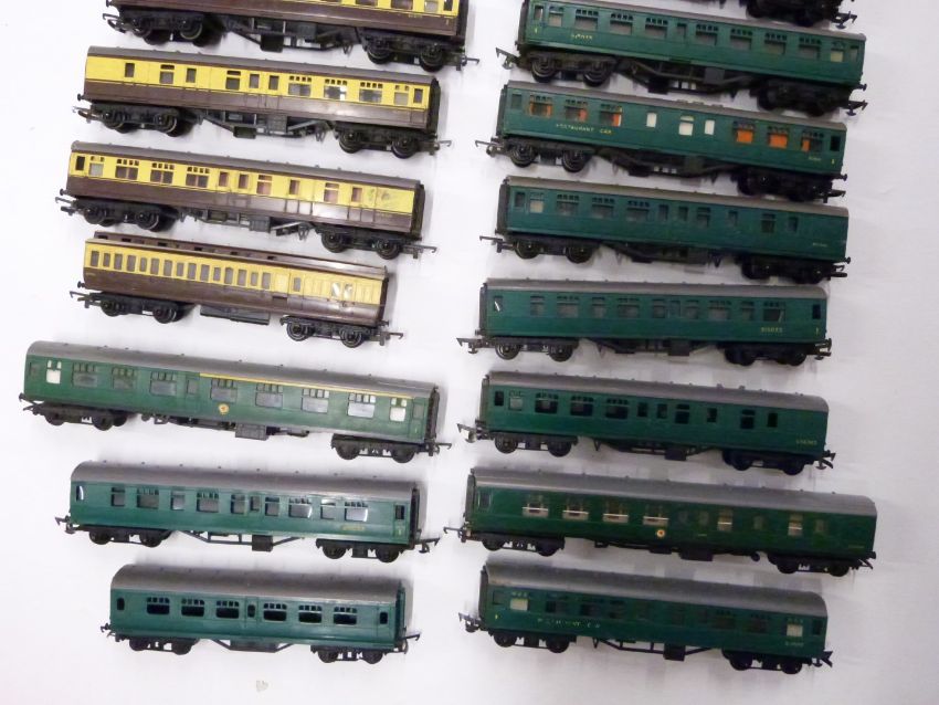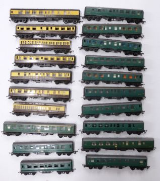 Twenty Tri-ang and Tri-ang Hornby 00 gauge model railway GWR and Southern coaches.