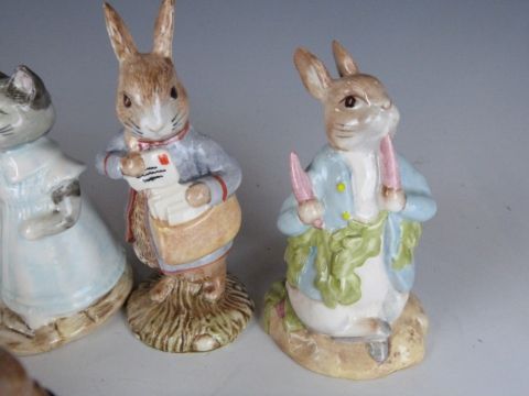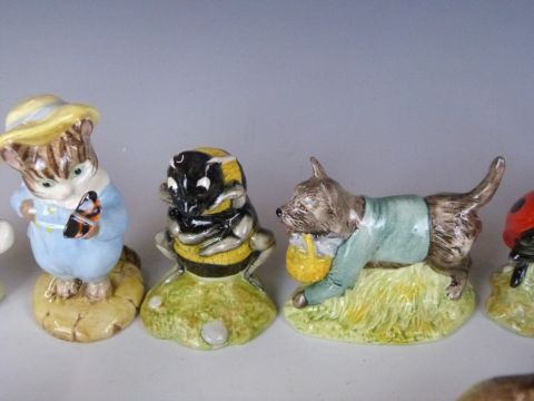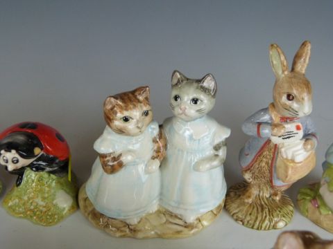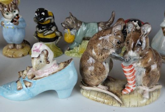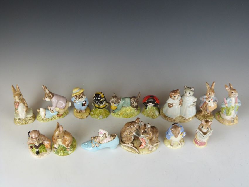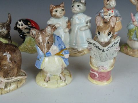 Fifteen Royal Albert Beatrix Potter figures including Johnny Town Mouse with Bag, John Joiner, Babbity Bumble, Tom Kitten with Butterfly, The Christmas Stocking, Gentleman Mouse Made A Bow etc