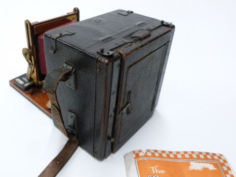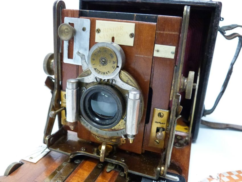 Sanderson Junior plate camera with red bellows, fitted with Goerz f=150mm 1:6,8 lens,