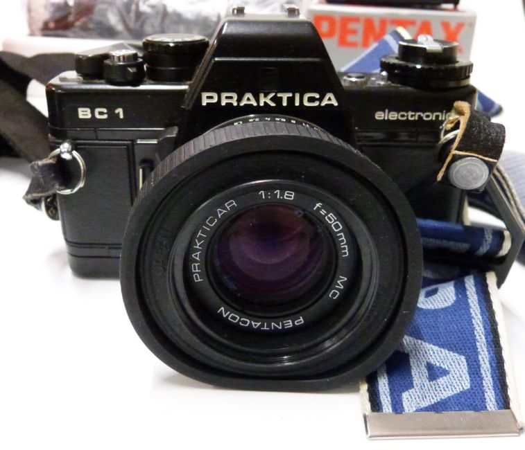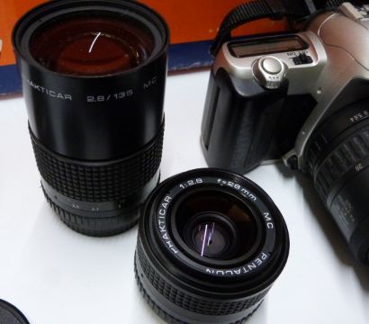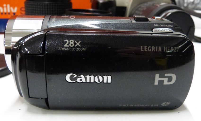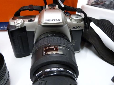 SLR and other cameras to include Pentax MZ-50 with 28-70 lens, Praktica BC1 with 28mm 1:2.8, 50mm 1:1.8 and 135mm 2.8 lenses, Surius 60-300mm f4.0-5.6 lens in box, Canon Legria HF R27 video camera, Agfa family set and Halina 3000