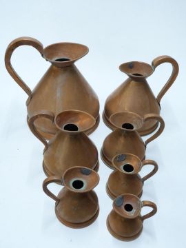 Set of seven copper measuring jugs from 1 gallon down to ½ gill, height of tallest 29cm