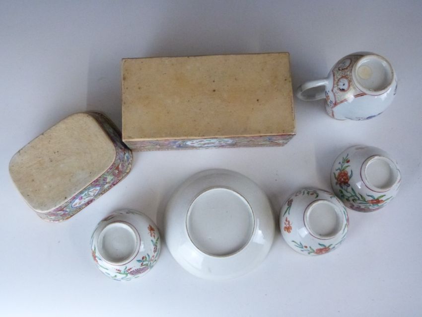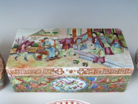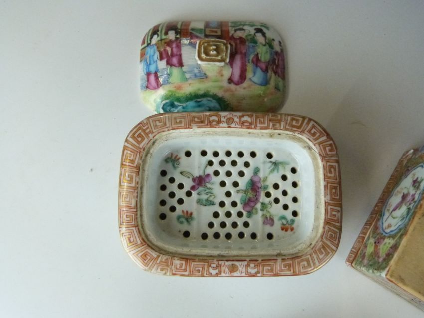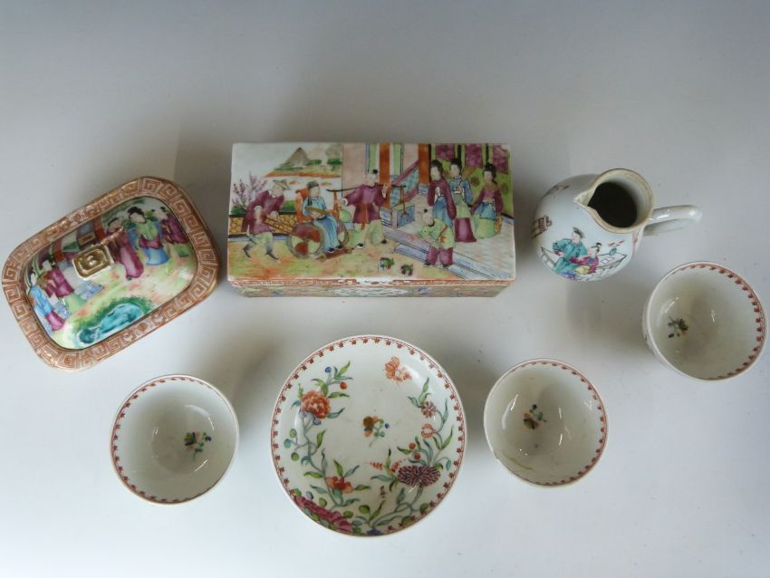 A 19th/20thC Canton Chinese porcelain including a covered brush/pen box, soap dish, sparrowbeak jug, tea bowls etc