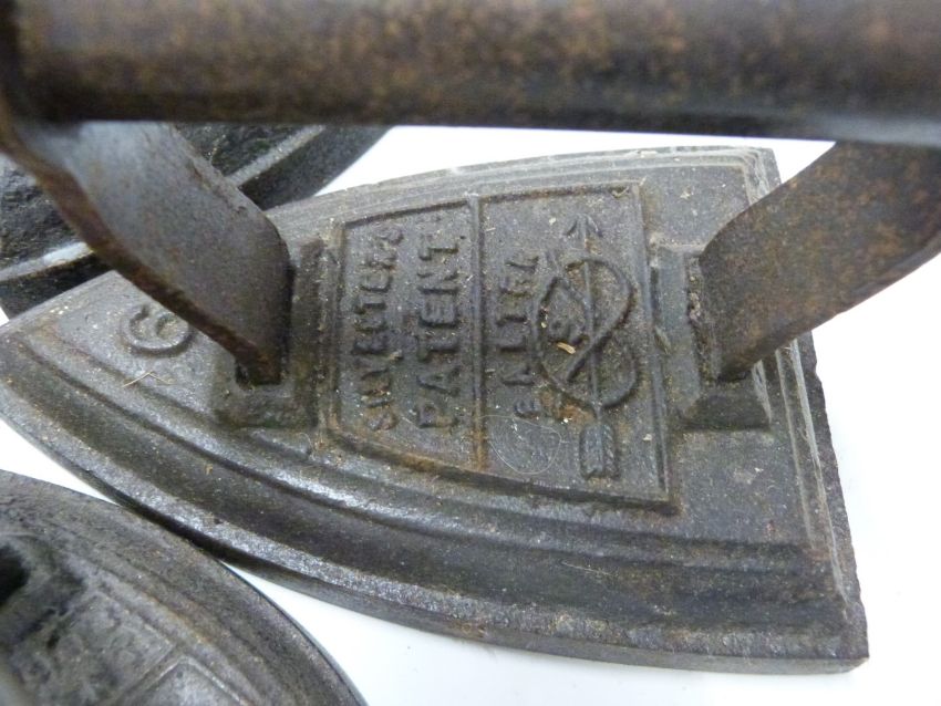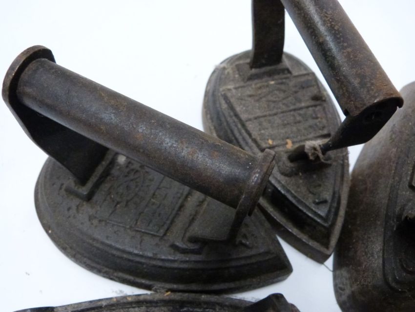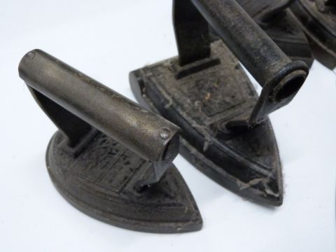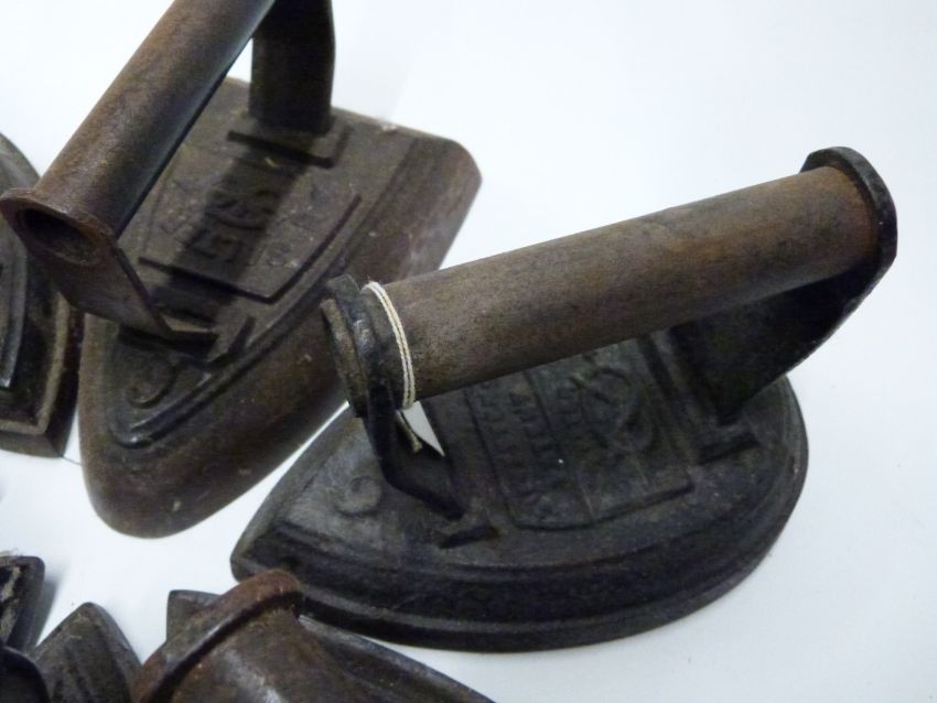 Seven Salter flat irons comprising numbers 1, 3, 4 and 6 pear shaped examples and number 4 and two number 6 standard shaped examples, length of longest 16.5cm