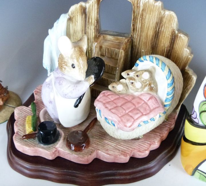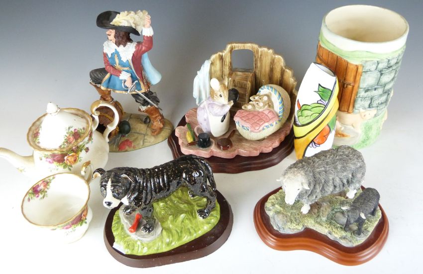 A collection of ceramics including Border Fine Arts Herdwick Ewe and Lamb and utensils jar, Royal Doulton figures including Staffordshire Bull Terrier, Royal Albert Old Country Roses teapot, Border Fine Arts Beatrix Potter tableau Two Bad Mice etc, tallest 20cm