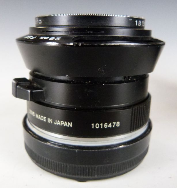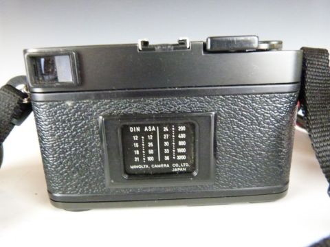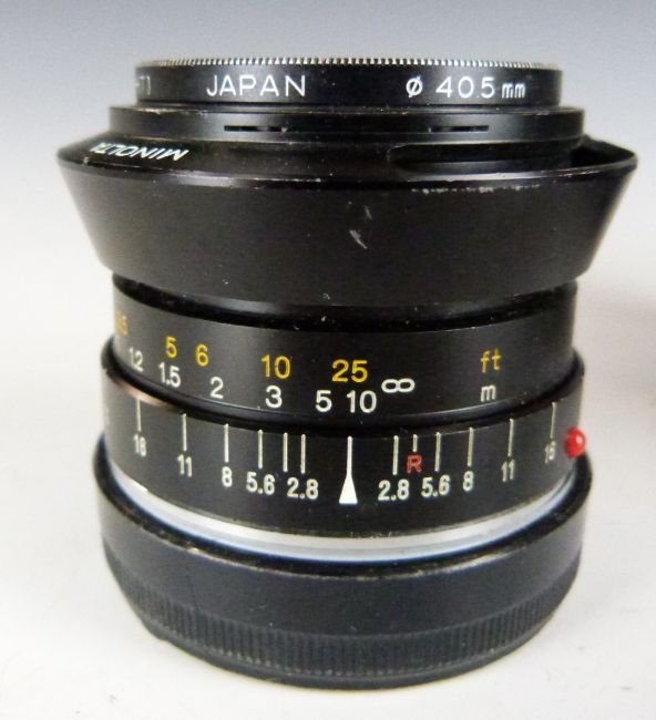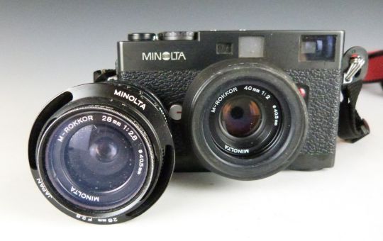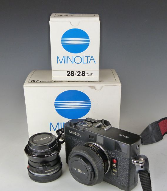Minolta CLE 35mm camera, serial number 1007103 with M-Rokkor 40mm 1:2 lens, together with a similar 28mm 1:2.8 lens and boxes for this lens and camera body