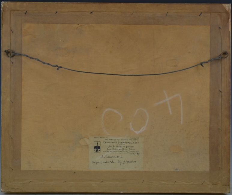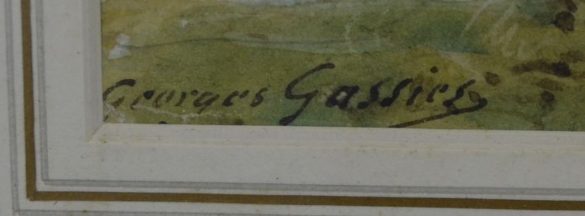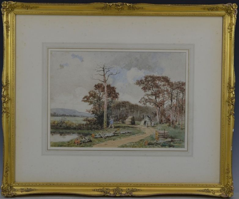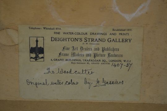Georges Gassies (1829-1919) watercolour 'The Woodcutter' cottage, figures and a man chopping down a dead tree, entitled verso, signed lower left and with label verso, 25 x 35cm, in ornate gilt frame