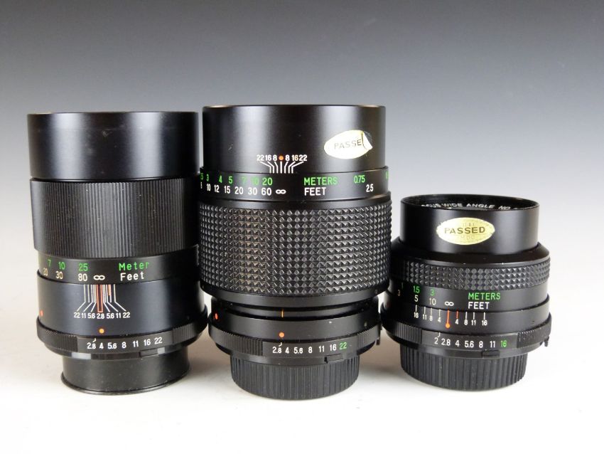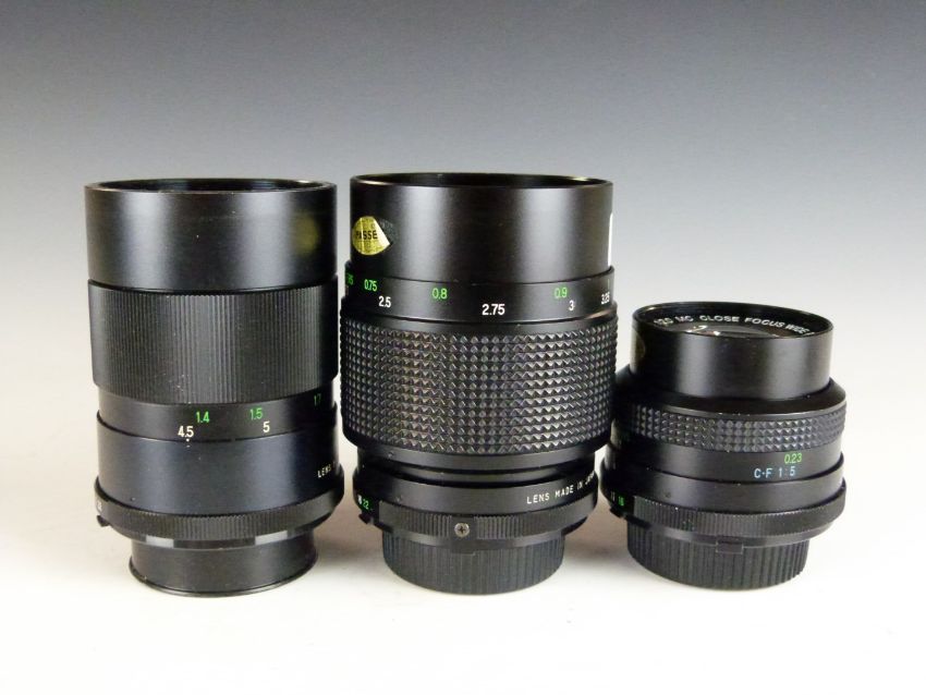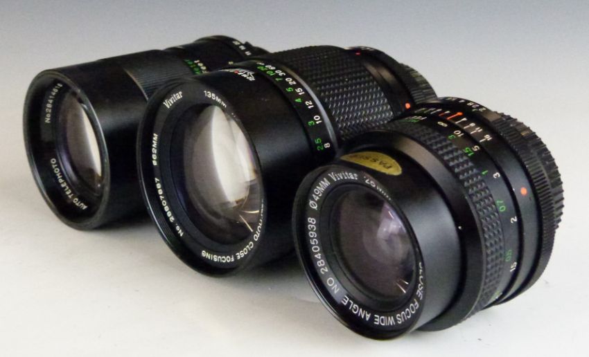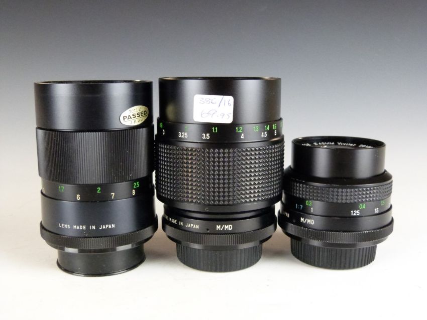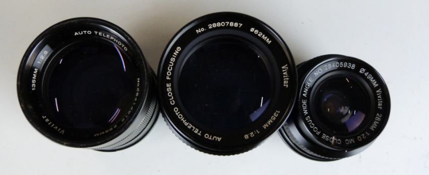Three Vivitar SLR camera lenses comprising 28mm 1:2.0, 135mm 1:2.8 62mm and 135mm 1:2.8 55mm examples, all with Minolta mounts