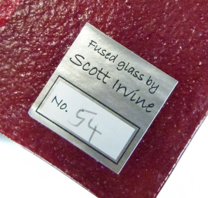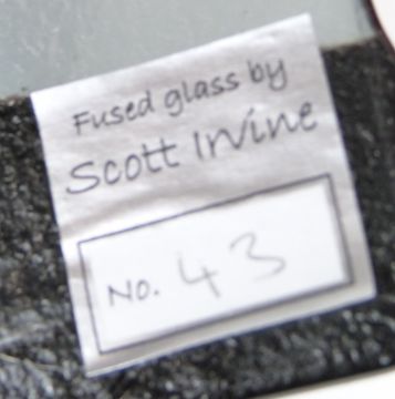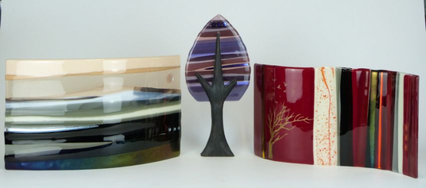Three pieces of art glass by Scott Irvine, one in the form of a tree, numbered 18, H31.5cm, one numbered 54, 37 x 20cm, and one numbered 43, 33 x 22cm