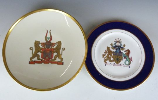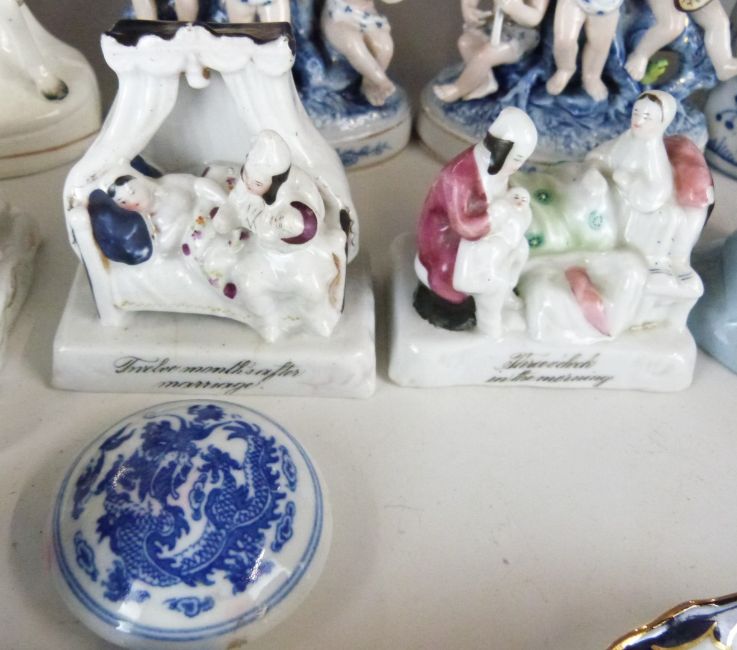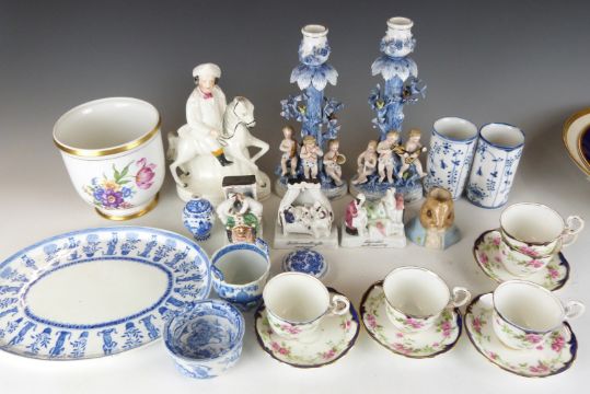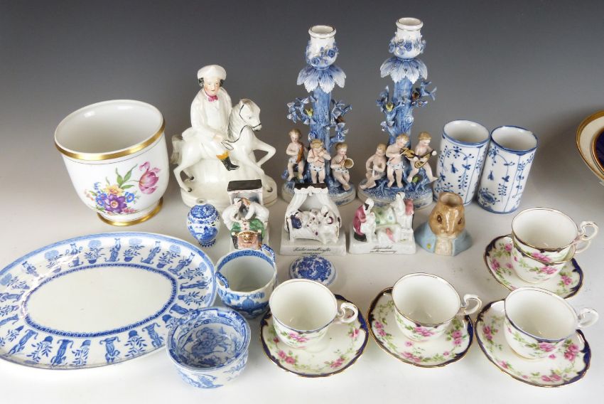 A group of ceramics including German figural candlesticks, Aynsley tea ware, Chinese puzzle vase, Beswick Beatrix Potter Peter Rabbit jug, Bristol/ Hanover exchange armorial pedestal bowl, three fairings etc