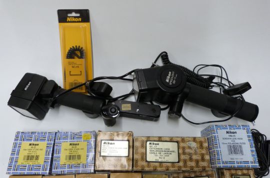 Nikon camera accessories to include MD-12 auto winder, SU-11 and SB-14 speedlight, lens hoods including boxed examples, boxes, focussing screens and SC-13 extension cord