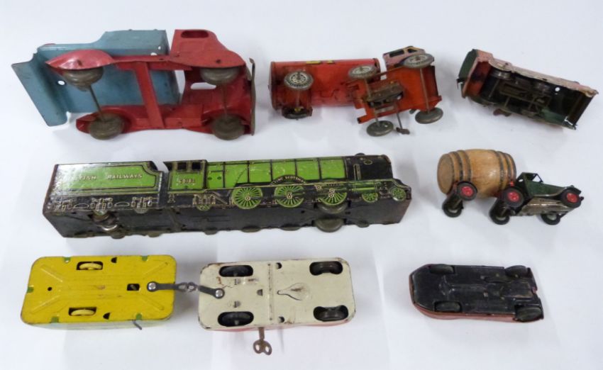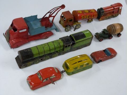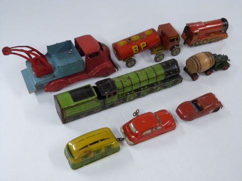Eight Brimtoy, Mettoy, Scalex, Tri-ang Minic and similar clockwork tinplate vehicles including trains, Watney's Barrel Lorry, Caraholm, tow truck etc.