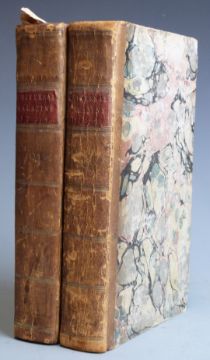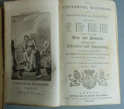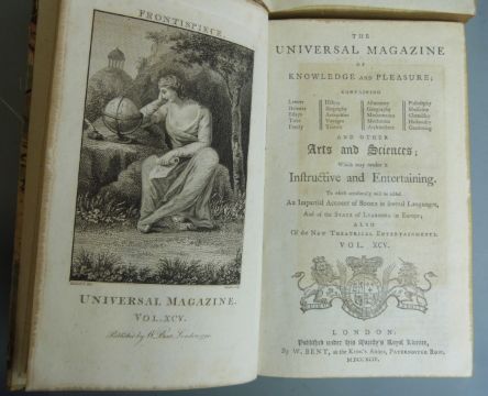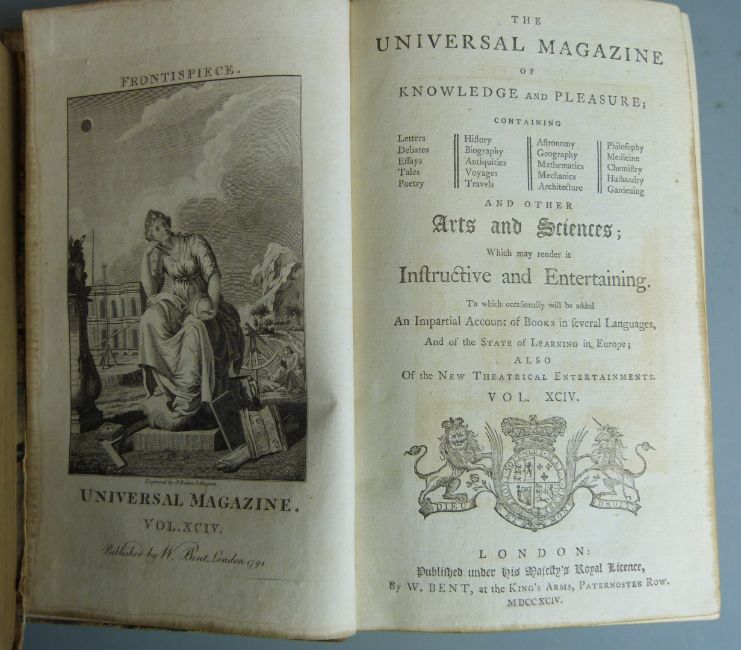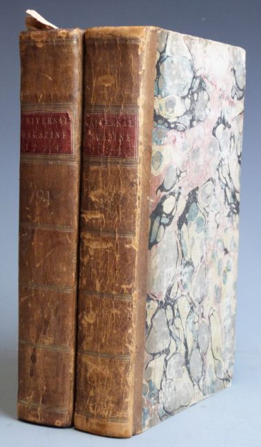 The Universal Magazine of Knowledge and Pleasure with Essays, Literature, Arts and Sciences etc volume XCIV printed 1794 first edition complete with 15 plates (including 3 folding maps and folding view of Chime Machine) and volume XCV printed 1794 first edition complete with 13 plates (including three folding maps and plan of Theatre Royal) bound in leather backed marbled boards with gilt lettered leather labels (2)