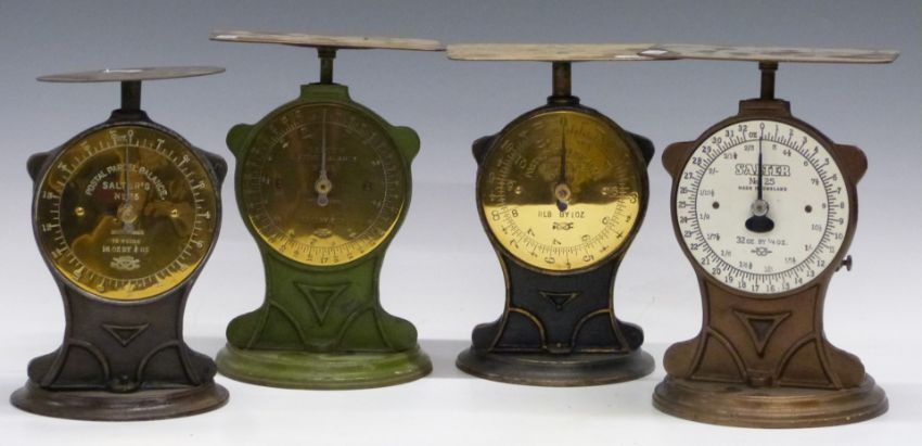 Four Salter No 25 postal parcel balances, comprising 16oz, two 32oz and an 11lb example, all with postage rates to dials, tallest 22cm