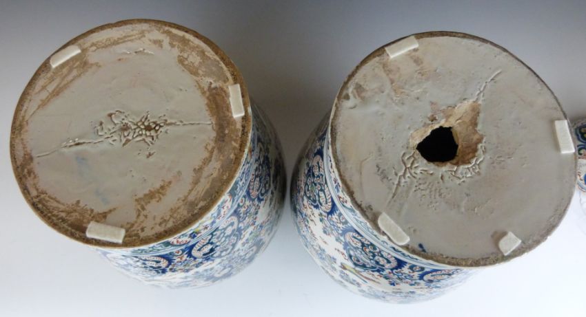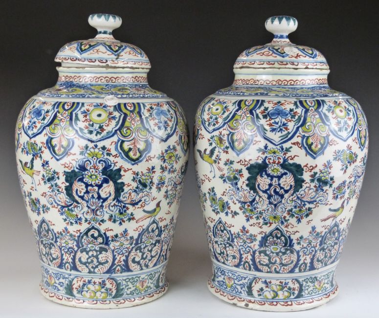 A pair of early 18thC Dutch Delft polychrome decorated covered baluster vases decorated with birds amongst foliage, old Christies, Ashby St Ledger labels still attached, lot 738, H39cm