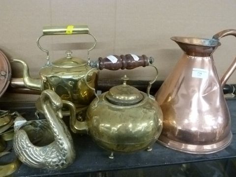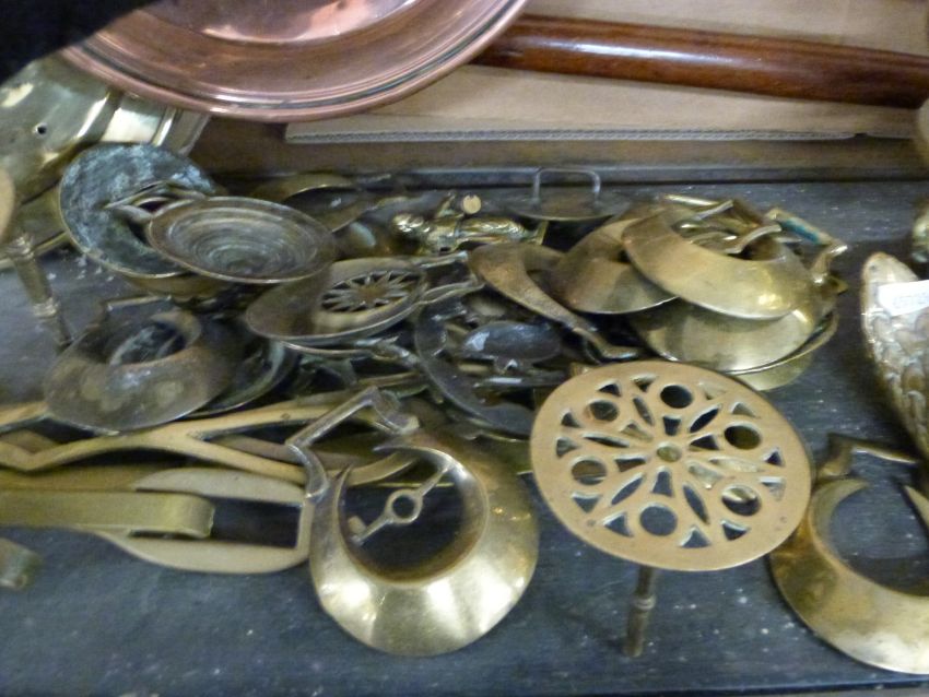 A collection of brass and copper ware including a measuring jug, kettles, warming pans, horse brasses etc