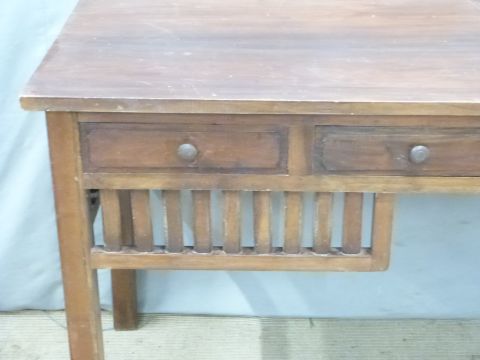 Mahogany or similar desk or side table fitted three drawers and slatted decoration below, W159 x D59 x H80cm