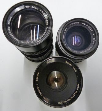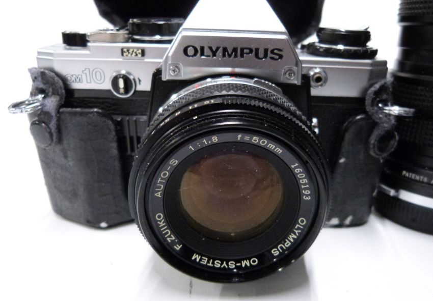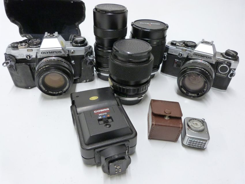 Two Olympus OM10 SLR cameras with f=50mm 1:1.4, f=50mm 1:1.8, and 35-70mm 1:4 lenses together with Vivitar 90mm 1:2.8 and 70-150mm 1:3.8 lenses