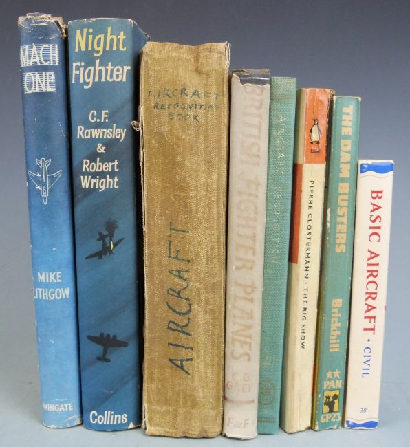 [WW2] Recognition Handbook of British Aircraft by the Air Ministry (Not to be Taken in The Air) Aircrew Training Manual (1940s) containing 100s of images of planes, single, twin and multi engined biplanes (Wellington, Spitfire, Hurricane etc) with span, lengths and heights and speeds with section showing tail and wing markings for different countries (ink stamps for Air Training Corps No 551 Squadron) with Observer Book of Basic Aircraft 1967, British Fighter Planes by C.G. Grey, Night Fighter, Aircraft Recognition by R.A. Saville-Sneath 1941 and four others (9)