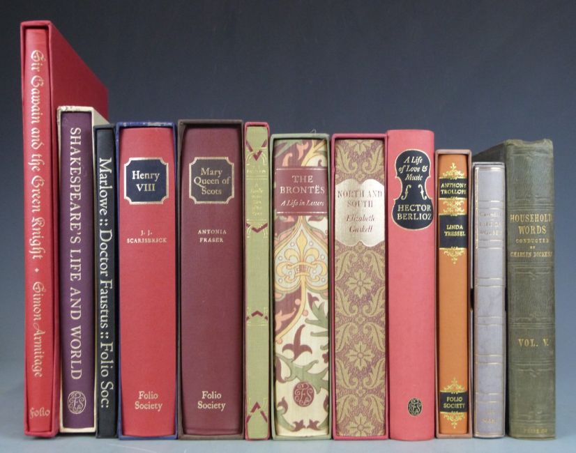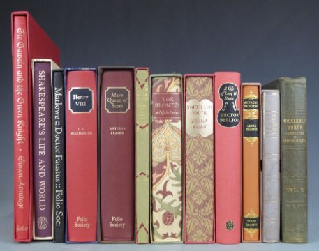 [Folio Society] Collection of volumes including Doctor Faustus by Marlowe with Wood engravings by George Tute 1993, Henry VIII by Scarisbrick 2004, Mary Queen of Scots by Antonia Fraser 2004, Thomas Wolsey 1962, The Pastons 1981, Shakespeare’s Life & World 2004, Sir Gawain and the Green Knight 2008, Brontes, Mrs. Gaskell etc and antique copy of Charles Dickens Household Words 1852 Vol.V in original cloth (12)
