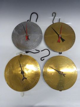 Four Salter milk spring balances comprising No 57 with chrome dial, No57 with brass dial, Fullwood milk recorder and one other