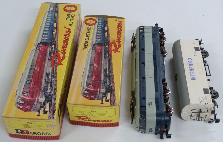 Four Rivarossi 0 gauge model railway locomotives and wagons including BO-Bo diesel E444 015, Esso Wagon 7571, 1st Class Old Time Coach etc, two in original boxes.