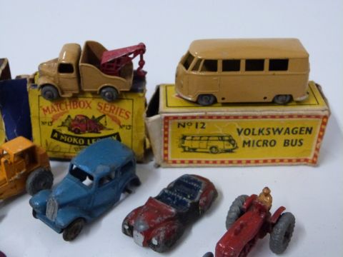 Thirty-three Matchbox Lesney 1-75, Dinky Toys, Charbens Miniature Series, Mobile Vehicle Series and similar diecast model vehicles including Volkswagen Micro Bus, Vauxhall, Brooke Bond Tea Van, steam roller, Matchbox Removals Service van etc, four in original boxes.