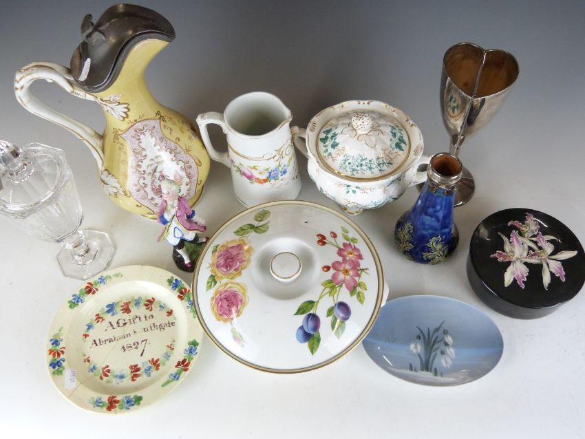 A collection of 19th/20thC ceramics and glass including Villeroy and Boch glass covered goblet, 19thC German figures, early Maling creamware plate to 'Abraham Southgate 1827' (damaged) Copenhagen dish etc