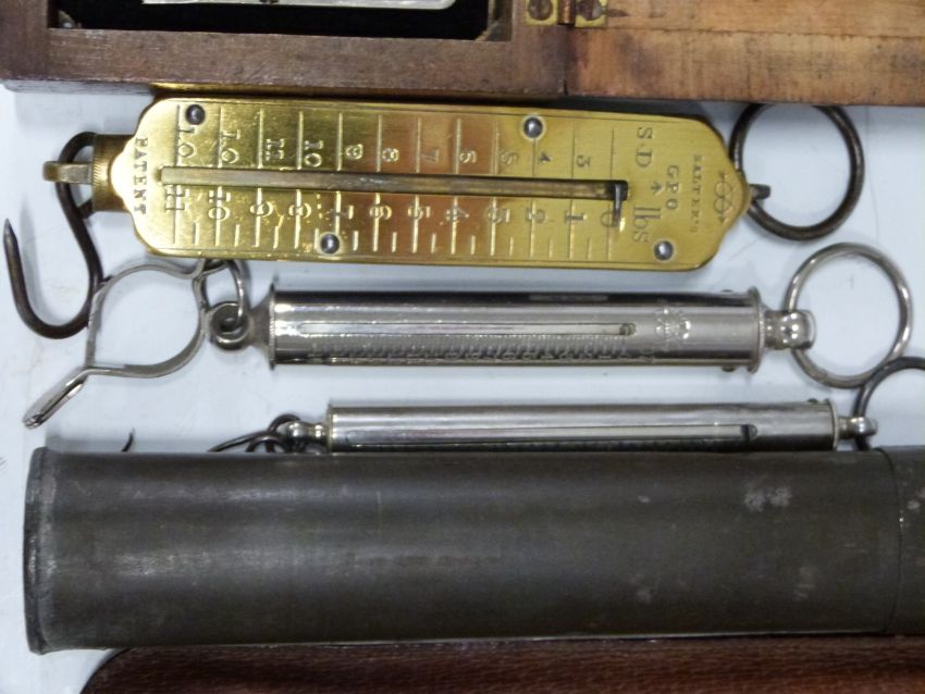 Eight cased Salter spring balances comprising pair in fitted case, letter scales in pouch, small letter scales in pouch marked "Weight and see", set in black leather case, GPO example in metal canister and a pair of GPO examples marked S.G.32/ 235