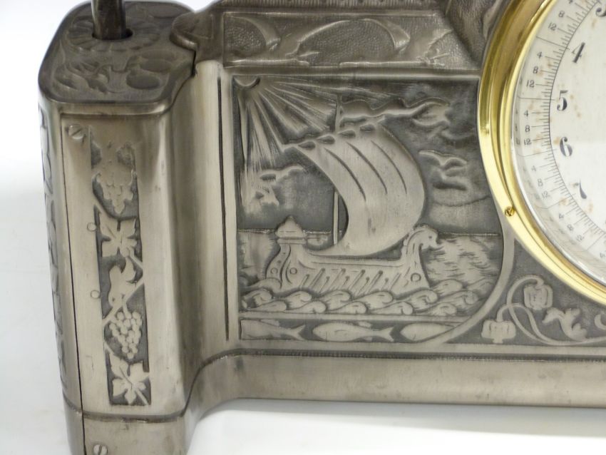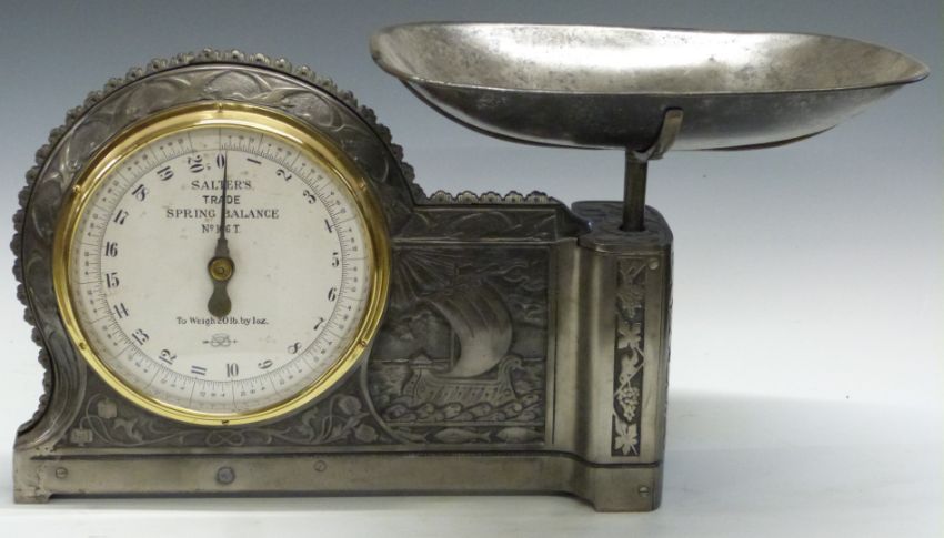 Salter's No 106T double sided shop scales or trade spring balance, the cast iron base decorated with birds, Art Nouveau style flowers and sailing ship with sun shining down from above, length 66cm