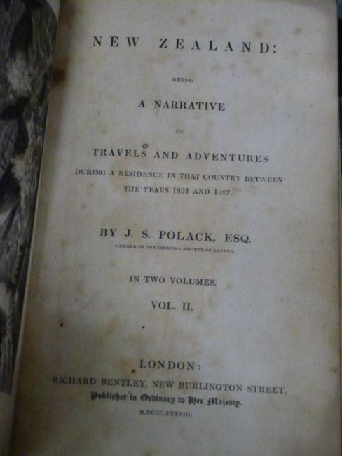 New Zealand: Being a Narrative of Travels and Adventures during a Residence in that Country between the years 1831 and 1837 by J.S. Polack published Richard Bentley 1838 in 2 volumes with 6 plates & 1 map (first plate in volume 1 is actually a duplicate of a plate used in volume 2) Recently bound in half leather with raised bands & gilt titles. A Ride Through the Disturbed Districts of New Zealand together with some account of the South Sea Islands 1870 with 4 plates + 2 maps and text illustrations in gilt cloth. Adventure in New Zealand from 1839-1844 by Edward Wakefield 1845 volume 2 only in original cloth (4)