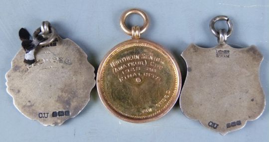 9ct gold and hallmarked silver football fobs including Gloucestershire Football Association Northern Senior Amateur Cup 1925-26 finalists fob, Stroud Hospital Cup and Dursley Association Football League