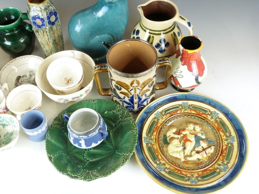 Two majolica plates / chargers, 19thC tea ware, probably Newhall, Wedgwood, Royal Doulton including an unpainted Cap'n Cuttle character jug etc