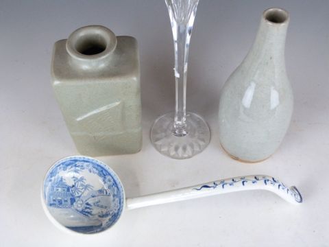 Asprey and Garrard oversized champagne flute, studio pottery vases and a 19thC blue and white ladle