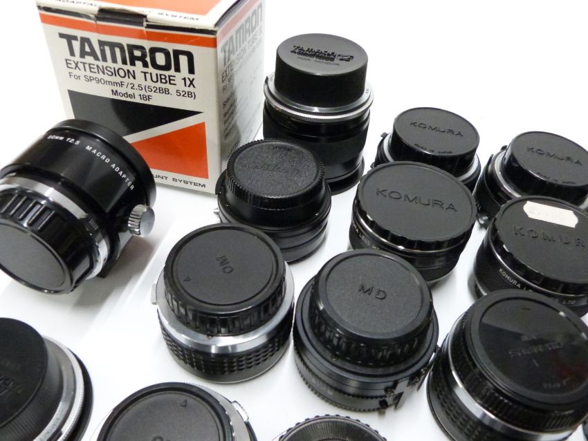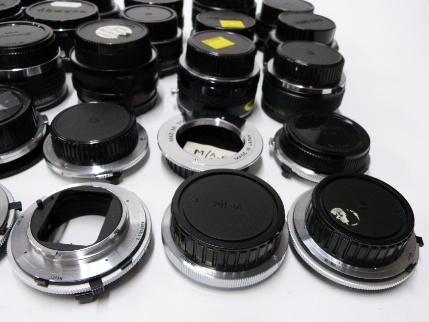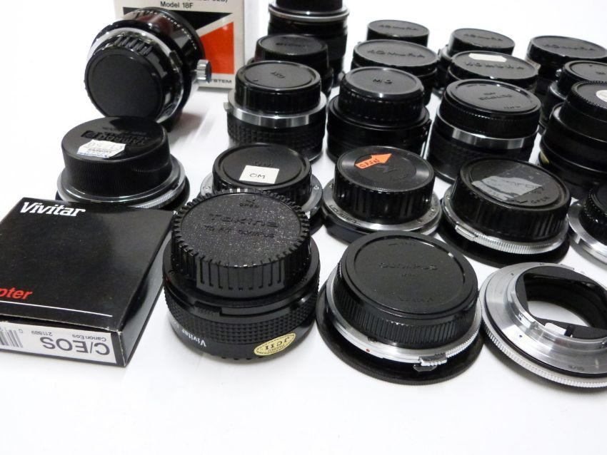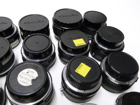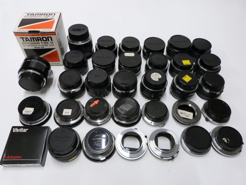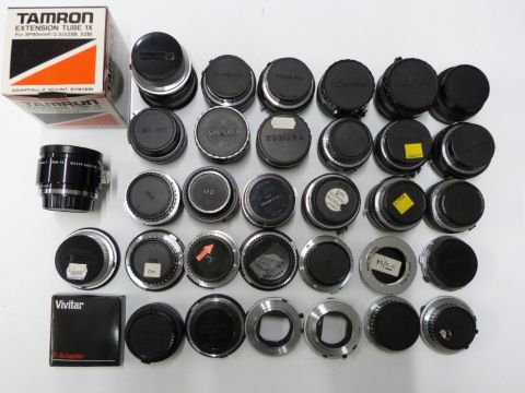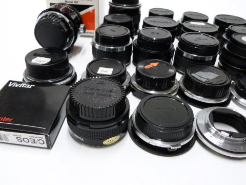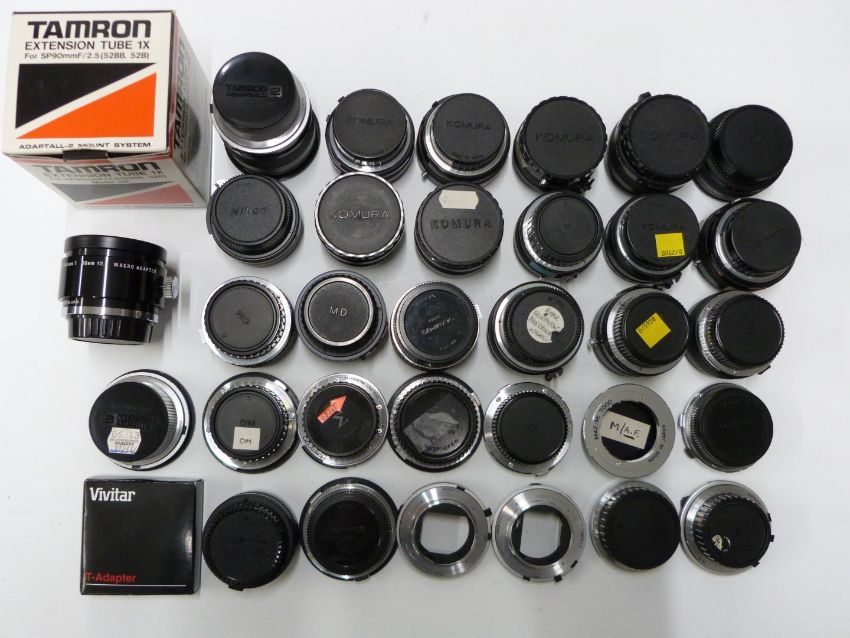 Camera lens adaptors and converters to include Adaptall 2 Olympus and Minolta, Tamron 2x teleconverter, DOI teleconverters, Komura Telemore 95 converters and Vivitar teleconverters