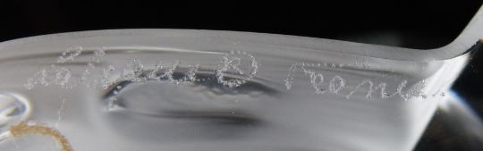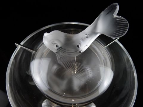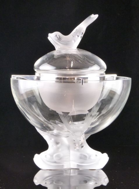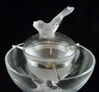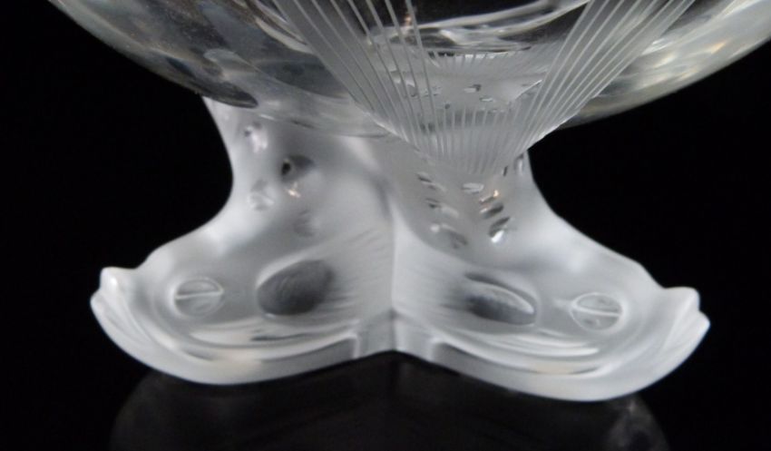 Lalique Igor frosted and clear glass caviar bowl with figural fish finial and feet, signed 'Lalique France', 26cm tall, 20cm in diameter.