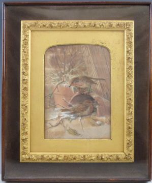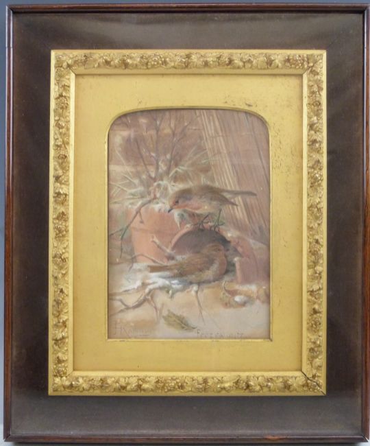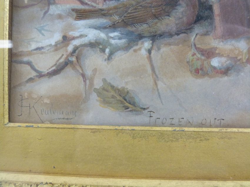 John Gerrard Keulemans (Dutch 1842-1912) watercolour 'Frozen Out' two robins finding shelter from the cold, signed lower left and titled lower right, 18 x 13cm