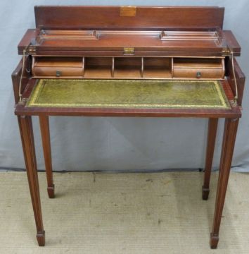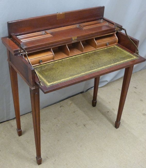 A mahogany desk with lift up lid and slide out leather inset surface and fitted interior, W85 x D42 x H83cm