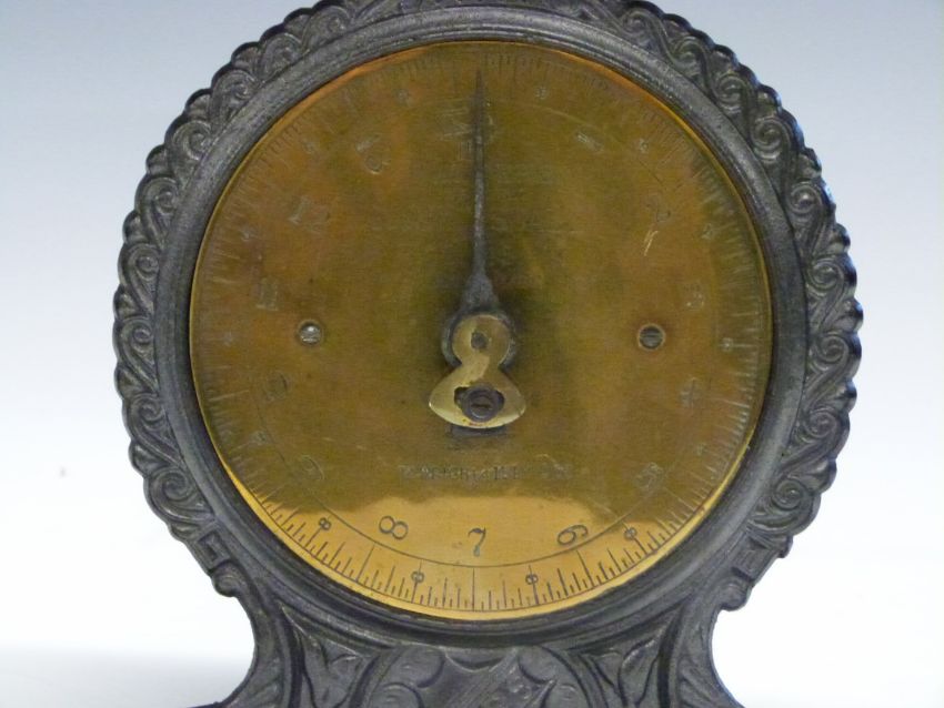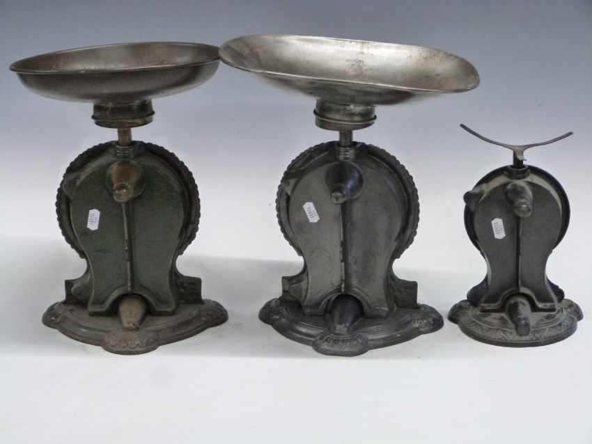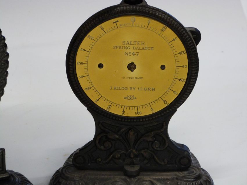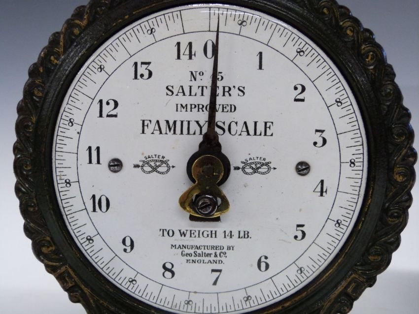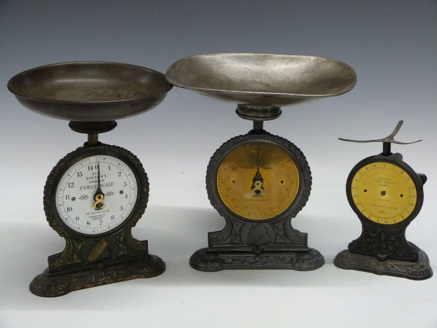 Three sets of Salter scales comprising two No 45 14lb Salter's Improved Family Scale together with a No 47 1 kilogram spring balance, all with decorative cast base and surround
