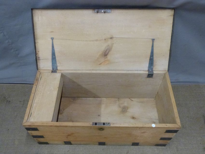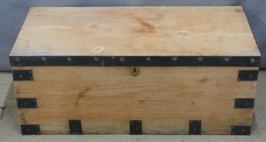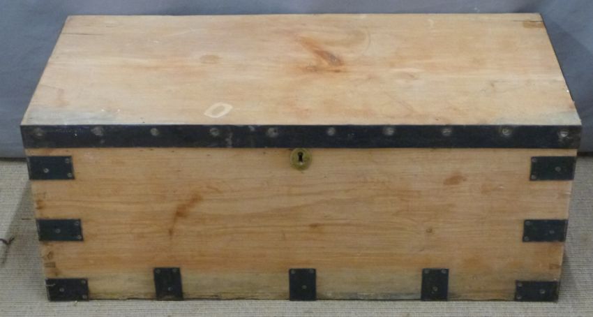 Metal bound pine trunk, W92 x D42 x H37cm