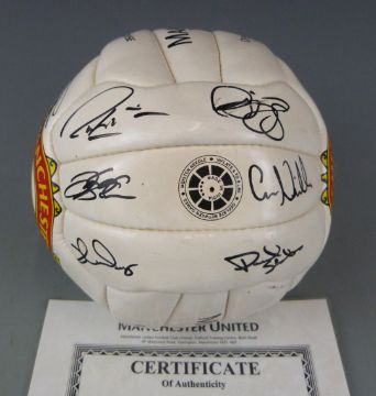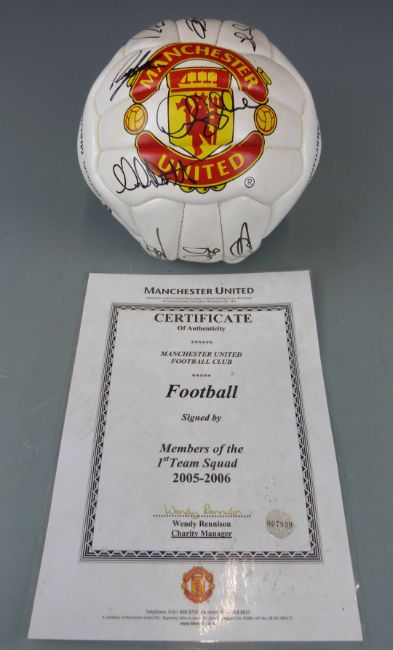 Two Manchester United signed footballs, one signed by members of the 1999 treble winning squad including David Beckham, Gary Neville, Paul Scholes etc, the other by members of the 2005/06 squad including Ole Gunnar Solskjaer and Nemanja Vidic, one with certificate of authenticity.