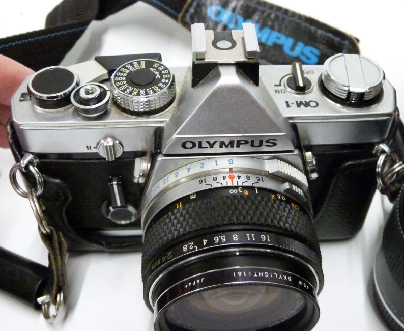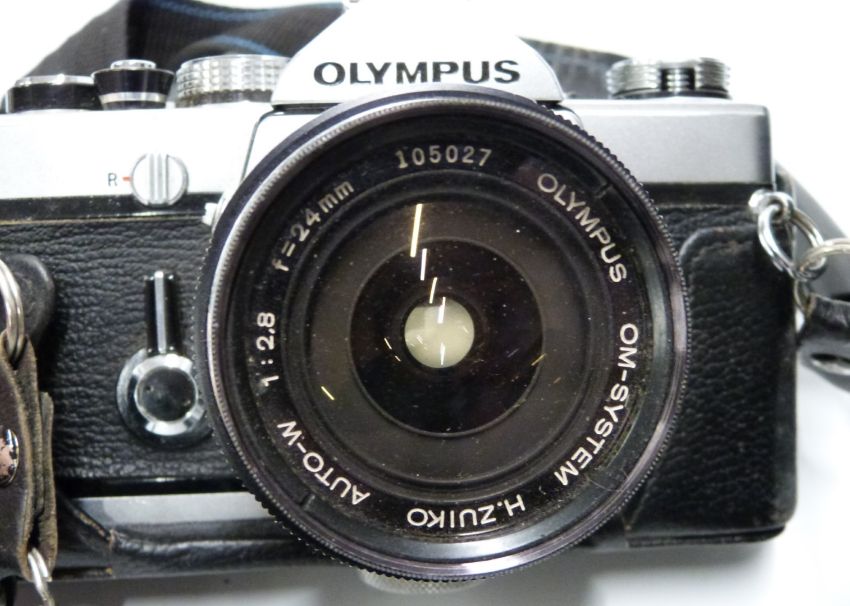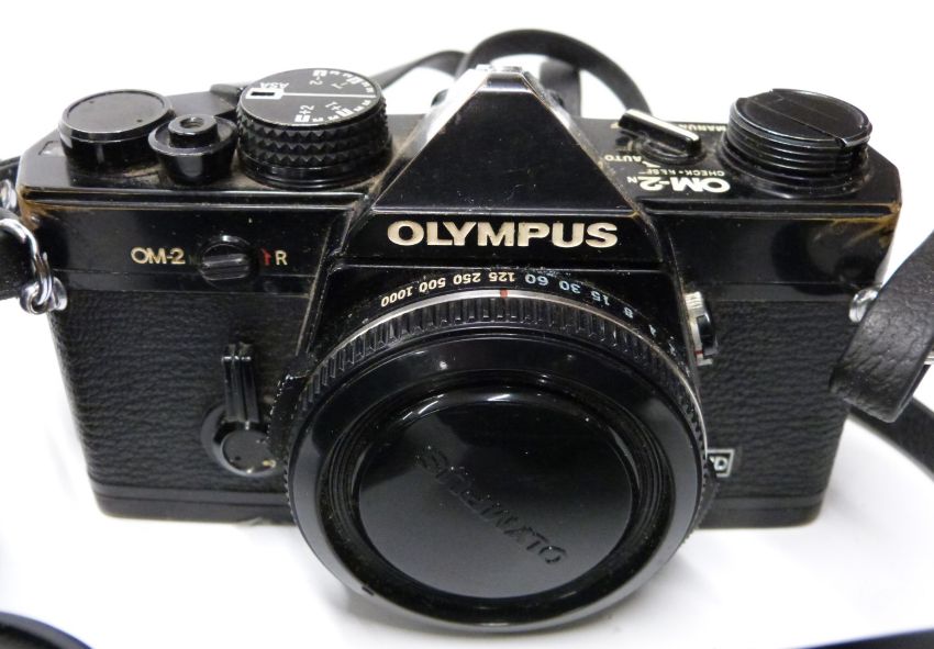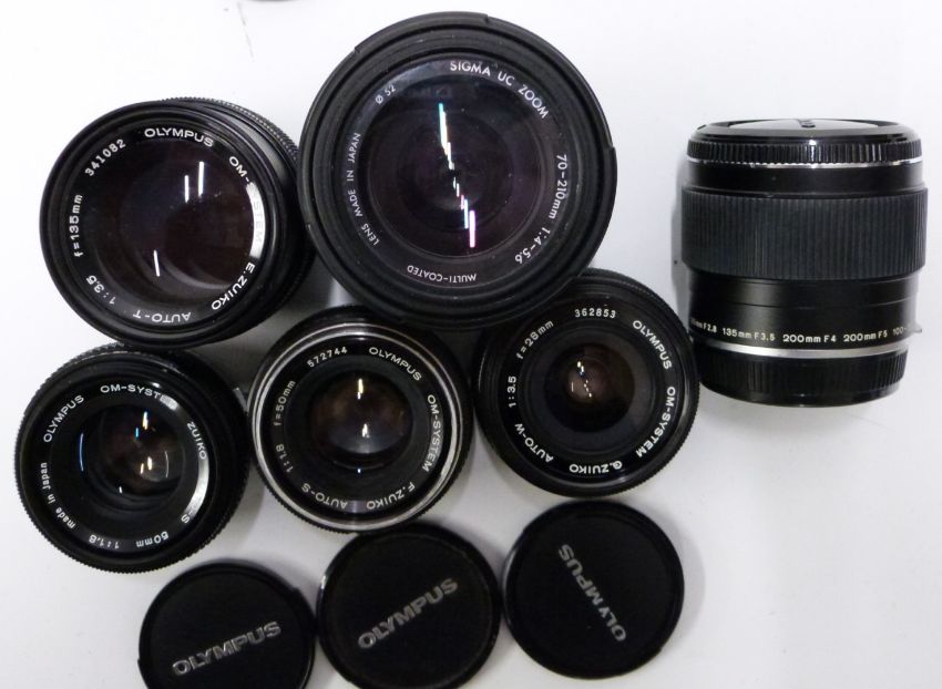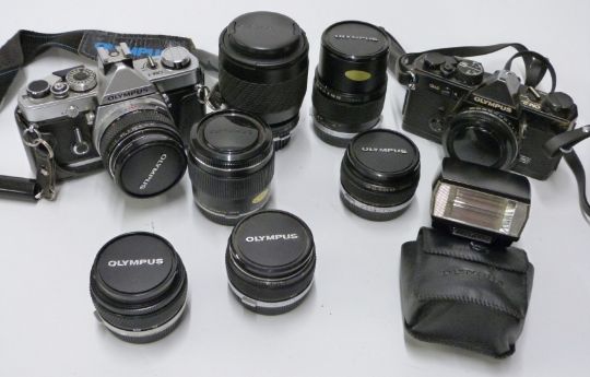Olympus SLR camera outfit to include OM-1 with 24mm 1:2.8 lens, OM-2n, Olympus 135mm 1:3.5, 28mm 1:3.5 and two 50mm 1:1.8 lenses and a Sigma 70-210mm 1:4-5.6 lens