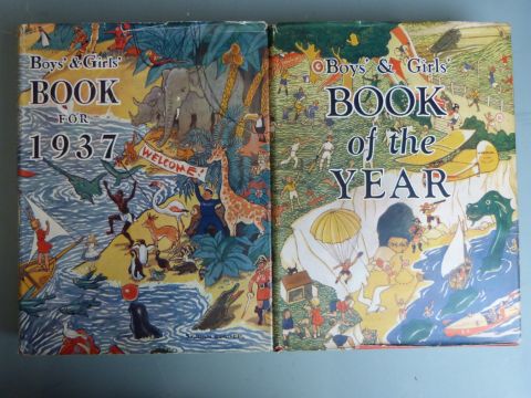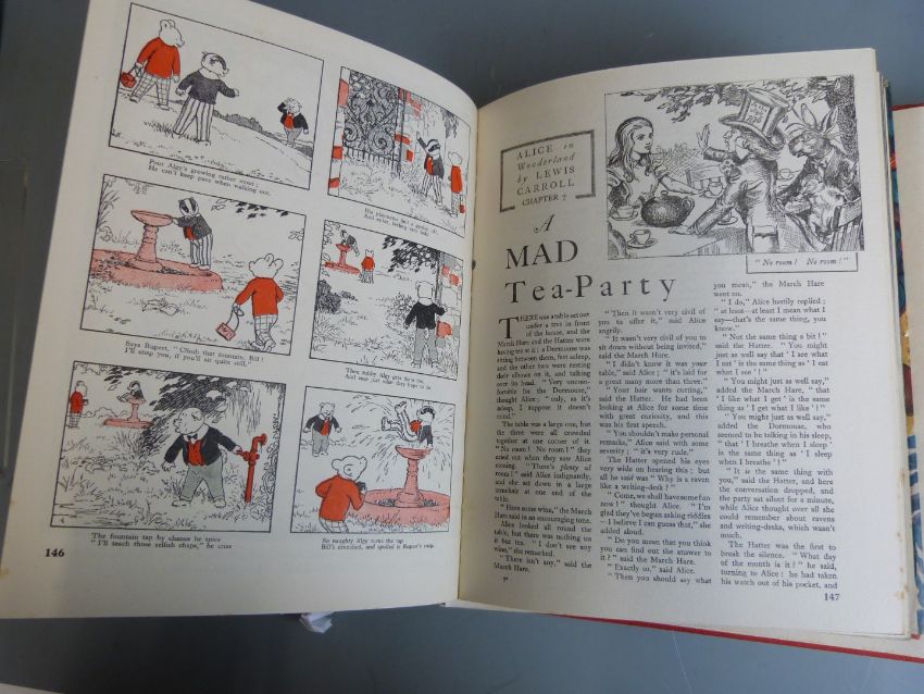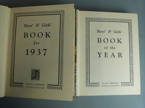 [Rupert the Bear] Boy's & Girl's Book of the Year for 1935 and 1937 published Daily Express with contents including Adventures of Rupert, Struwwelpeter, Lawrence of Arabia, Carroll's Alice in Wonderland, Last of the Mohicans, Punch and Judy, Scott of the Antarctic, Three Musketeers etc, cloth bound volumes in original colour dust-wrappers (2)