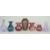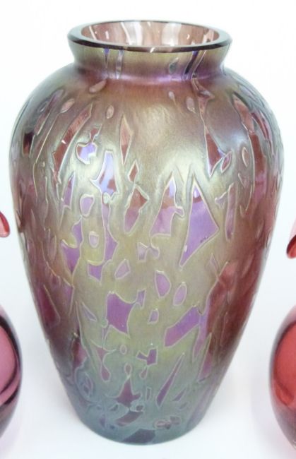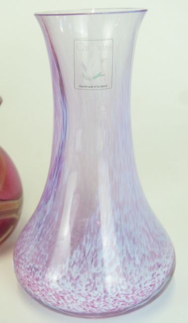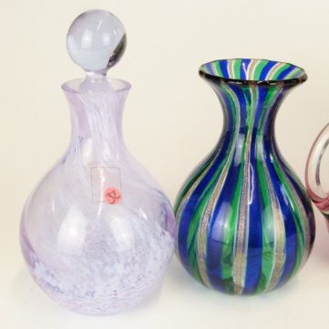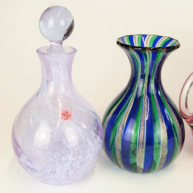 Seven pieces of coloured and iridescent glass comprising Okra and Royal Brierley vases, a pair of cranberry jugs, Caithness vase and scent bottle and one other vase, largest 15cm tall.